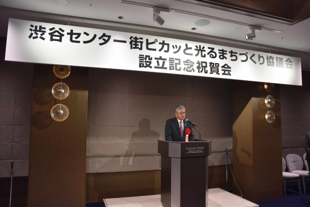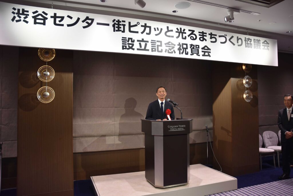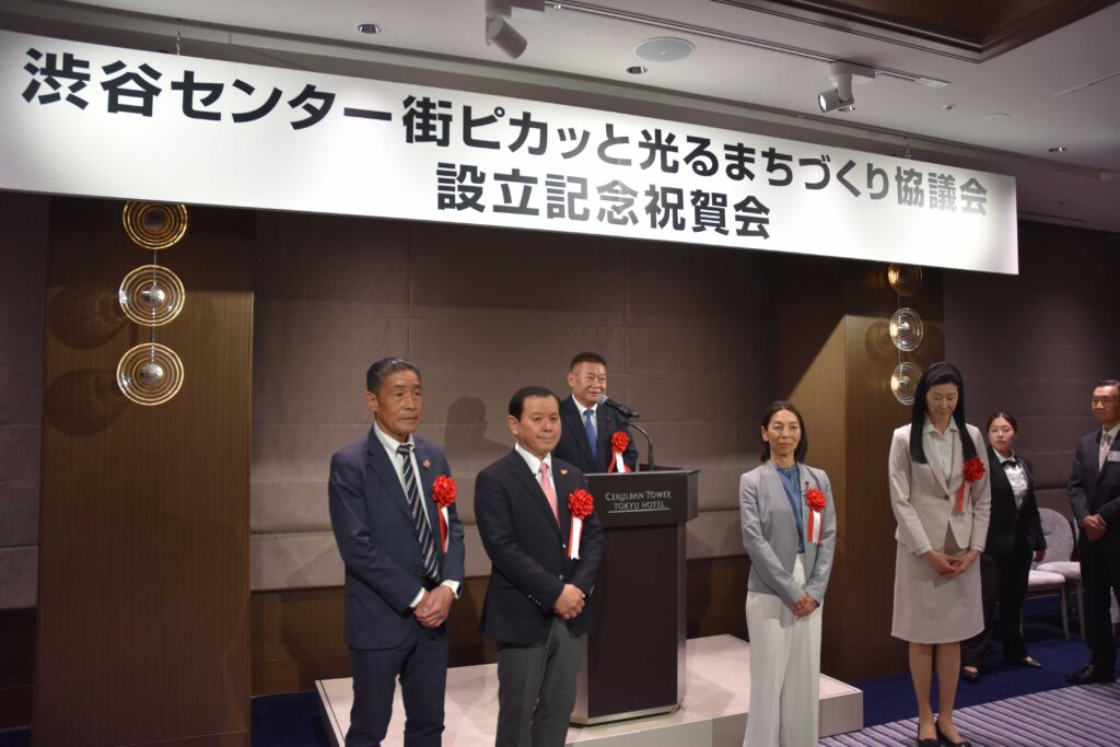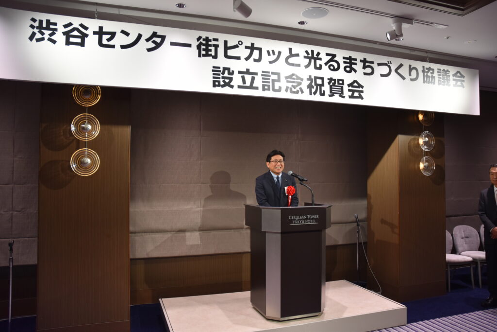 また、同日18時より発足を記念した祝賀会が開催され、小野寿幸 代表幹事よりお礼の挨拶をさせていただきました。その後、長谷部渋谷区長、当組合と防災協定にある佐世保市長の宮島大典様、東急株式会社 取締役 専務執行役員 髙橋 俊之様、当協議会の特別アドバイザーの千葉大学大学院 村木 美貴教授、東京都議会議員 龍円 愛梨様よりお祝いの言葉を頂戴しました。