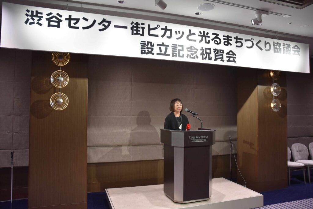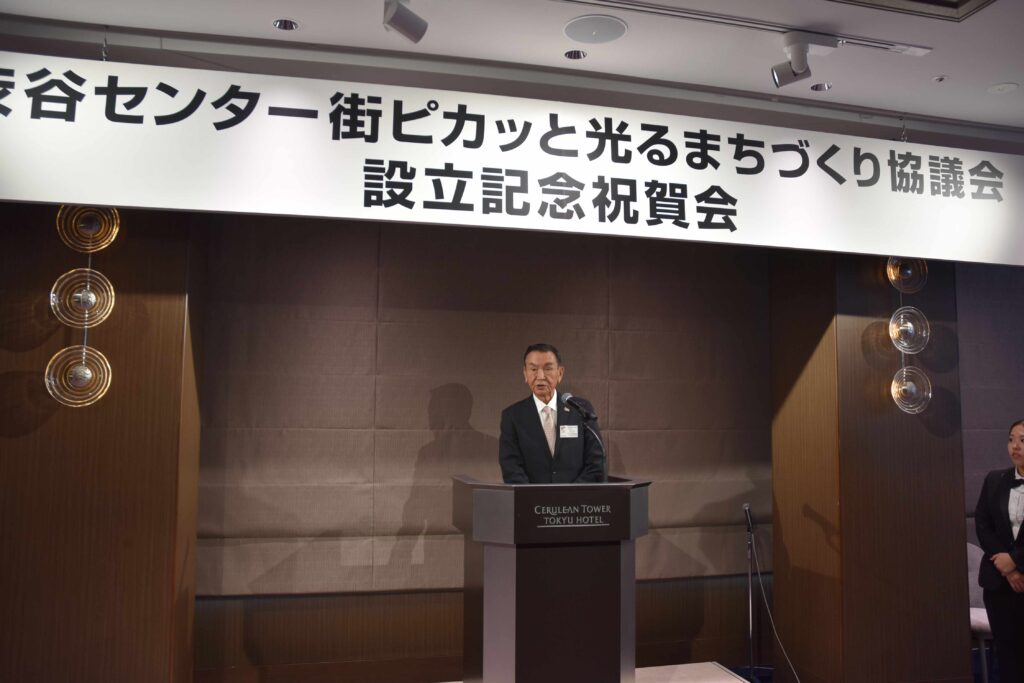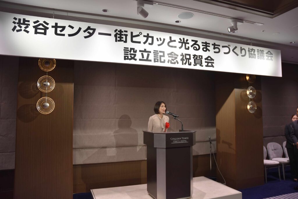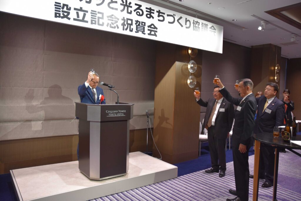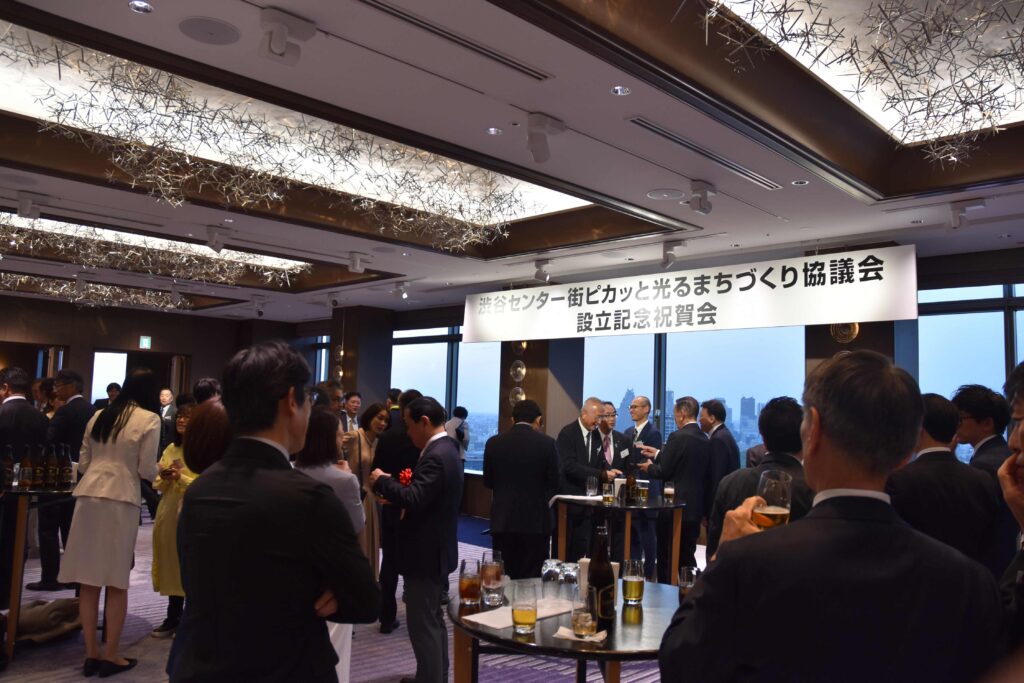 また、同日18時より発足を記念した祝賀会が開催され、小野寿幸 代表幹事よりお礼の挨拶をさせていただきました。その後、長谷部渋谷区長、当組合と防災協定にある佐世保市長の宮島大典様、東急株式会社 取締役 専務執行役員 髙橋 俊之様、当協議会の特別アドバイザーの千葉大学大学院 村木 美貴教授、東京都議会議員 龍円 愛梨様よりお祝いの言葉を頂戴しました。